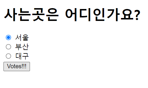 http://localhost:8000/polls/ 의 질문에 대한 링크를 누르면 선택된 항목을 가지고 서버 쪽 프로그램을 호출할 수 있도록 사용자 입력 양식을 만들어 볼 거예요.(radio, button 등등)